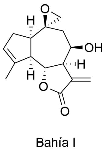 Lactona-12,6 del ácido 10,14-epoxi-6α,8β-dihidroxi-1ξ,10ξ-guaia-3,11(13)-dien-12-oico [3aR-(3aα,4β,6β,6aα,9aα,9bβ)]-3,3a,4,5,6a,7,9a,9b-octahidro-4-hidroxi-9-metil-3-metilen- espiro[azuleno[4,5-b]furan-6(2H),2′-oxiran]-2-ona (+)-Bahia I